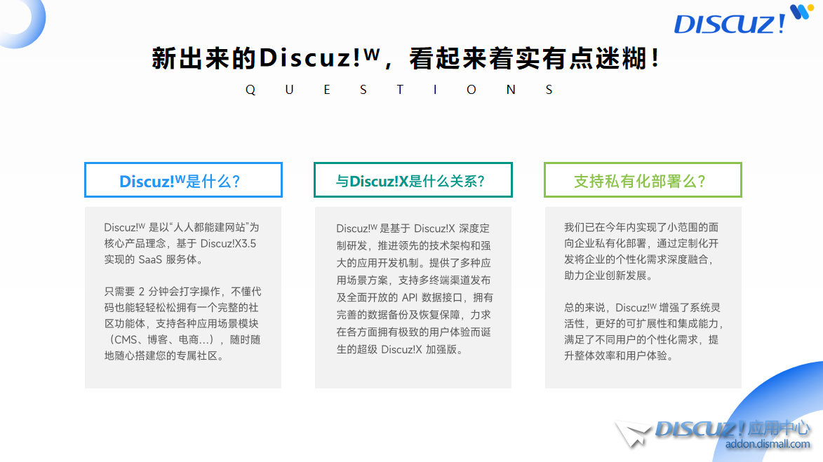 我開通了discuz W 測試版。發(fā)展好多功能都沒有了,后臺的站點功能,里面沒有各個功能的開關(guān)了。圈子和其 ...