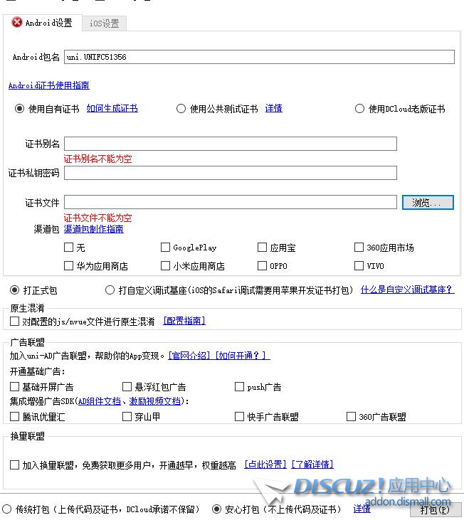 點擊manifest.json 文件獲取APPID,填寫名稱描述,設(shè)置APP圖標(biāo)和啟動頁。 ![]() 設(shè)置好后點擊:發(fā)行-云打包。 ![]() 配置安卓證書后打包即可。 安卓證書在線制作:http://www.applicationloader.net/appuploader/keystore.php(剛申請完證書需要等幾分鐘才可以用?。?br /> ![]() 第三方登錄最好關(guān)了因為不在小云平臺應(yīng)該無法使用。 ![]() 找到板塊全選否則APP里就一個板塊。(選擇完后重啟APP就可以看到。) ![]() 短信驗證注冊本人沒試過所以關(guān)了。 ![]() 本人制作完成后的樣子。 ![]() ![]() ![]() 本人技術(shù)有限不知道為什么不能發(fā)帖回帖,如果有人會改可以試試。 |