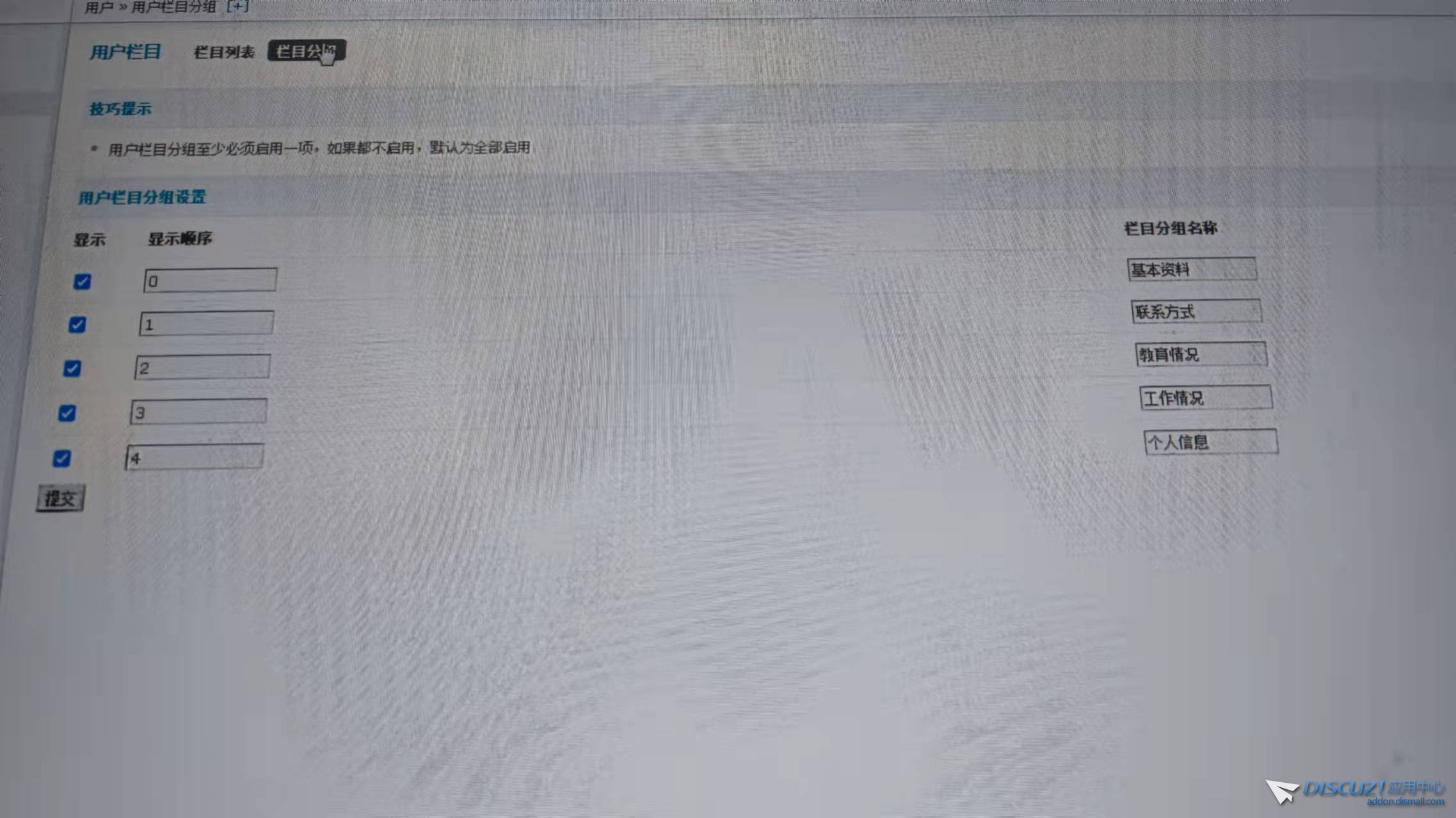 我在后臺(tái)調(diào)整用戶欄目,在欄目列表和欄目分組啟用了一些欄目設(shè)置,但是怎么調(diào)整,論壇里面的個(gè)人用戶界面也只有用戶名。 但是設(shè)置是可以看到已開欄目的,在這里設(shè)置的話,數(shù)據(jù)也能正常的進(jìn)數(shù)據(jù)庫(kù) 就很神奇,也不知 ... 查看全文