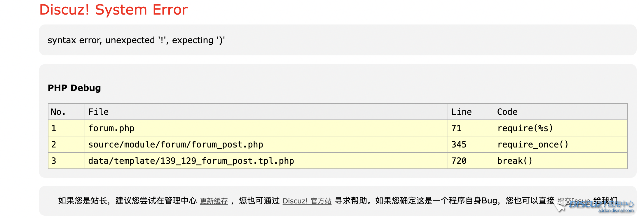 發(fā)帖頁面出現(xiàn)Discuz! System Error syntax error, unexpected '!', expecting ')' 這個是什么意思怎么解決? 查看全文