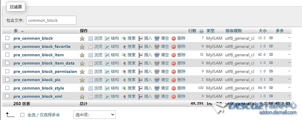 插件卸載后,插件確實不在后臺顯示了,但是文件確實還在服務器,所以我每次卸載插件前都會復制插件標識,用ftp登陸或者寶塔卸載相關插件文件 清理數(shù)據(jù)庫和無用遺留diy 分別查找common_block、_common_diy_data與_common_template_block這幾個表 與所有插件標識對應的刪除 |
