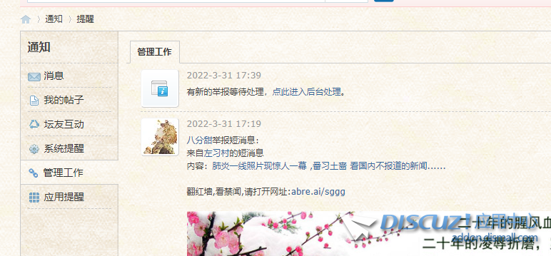 論壇進(jìn)lun子了,給用戶(hù)發(fā)短消息被舉報(bào),然后那條舉報(bào)通知連帶短消息就一直躺在我管理工作里了 lun子刪除清空用戶(hù)數(shù)據(jù)了,但那條還在,通知那里的屏蔽點(diǎn)了也沒(méi)用 我好慘,打開(kāi)后臺(tái)就是巨長(zhǎng)的lun子消息…… 求助?。?! ... 查看全文