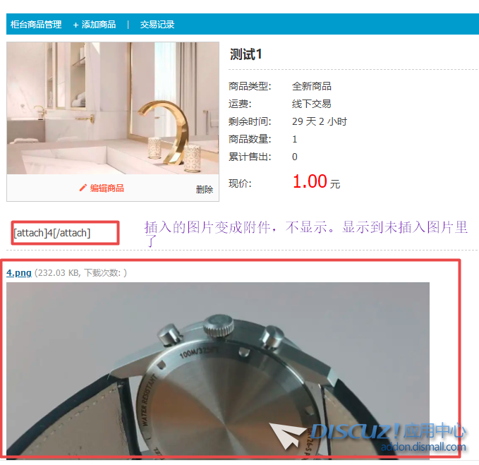 在發(fā)表出售商品貼時,在編輯器里插入圖片后保存后,正文里卻顯示是插入附件的形式,不顯示圖片。內(nèi)容后面有未插入圖片顯示。見下圖: 只有發(fā)出售商品貼才會有這種問題,常規(guī)貼正常。 現(xiàn)在用的是3.4版,是剛啟 ... 查看全文