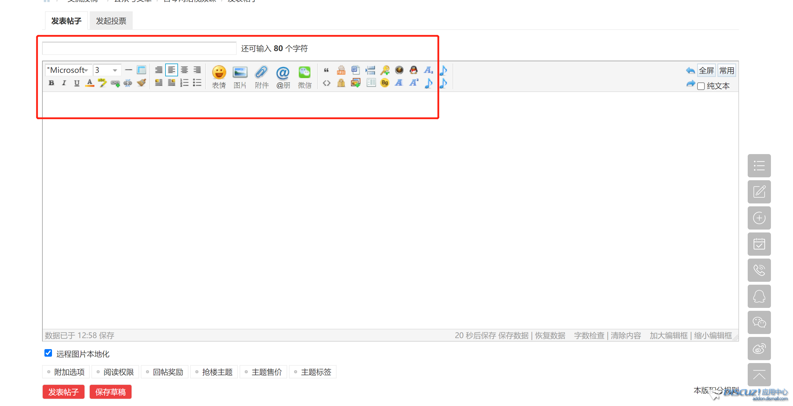 論壇后臺/用戶/管理組(用戶組)/基本設置(編輯)/帖子相關/允許使用 [audio] [media] [flash] 等多媒體代碼:是 |
