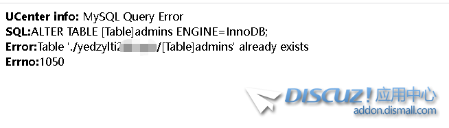 大佬們這是什么原因? UCenter info: MySQL Query Error SQL:ALTER TABLE [Table]admins ENGINE=InnoDB; Error:Table './yedzylti28krqet/[Table]admins' already exists Errno:1050 查看全文
