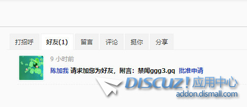 反饋應(yīng)用中心了,不過(guò)估計(jì)春節(jié)處理有延遲。 另外 X3.5 版本可以通過(guò) home.php?mod=spacecp&ac=privacy&op=other 入口在個(gè)人層面關(guān)閉添加好友、添加收聽(tīng)等互動(dòng)權(quán)限。 |