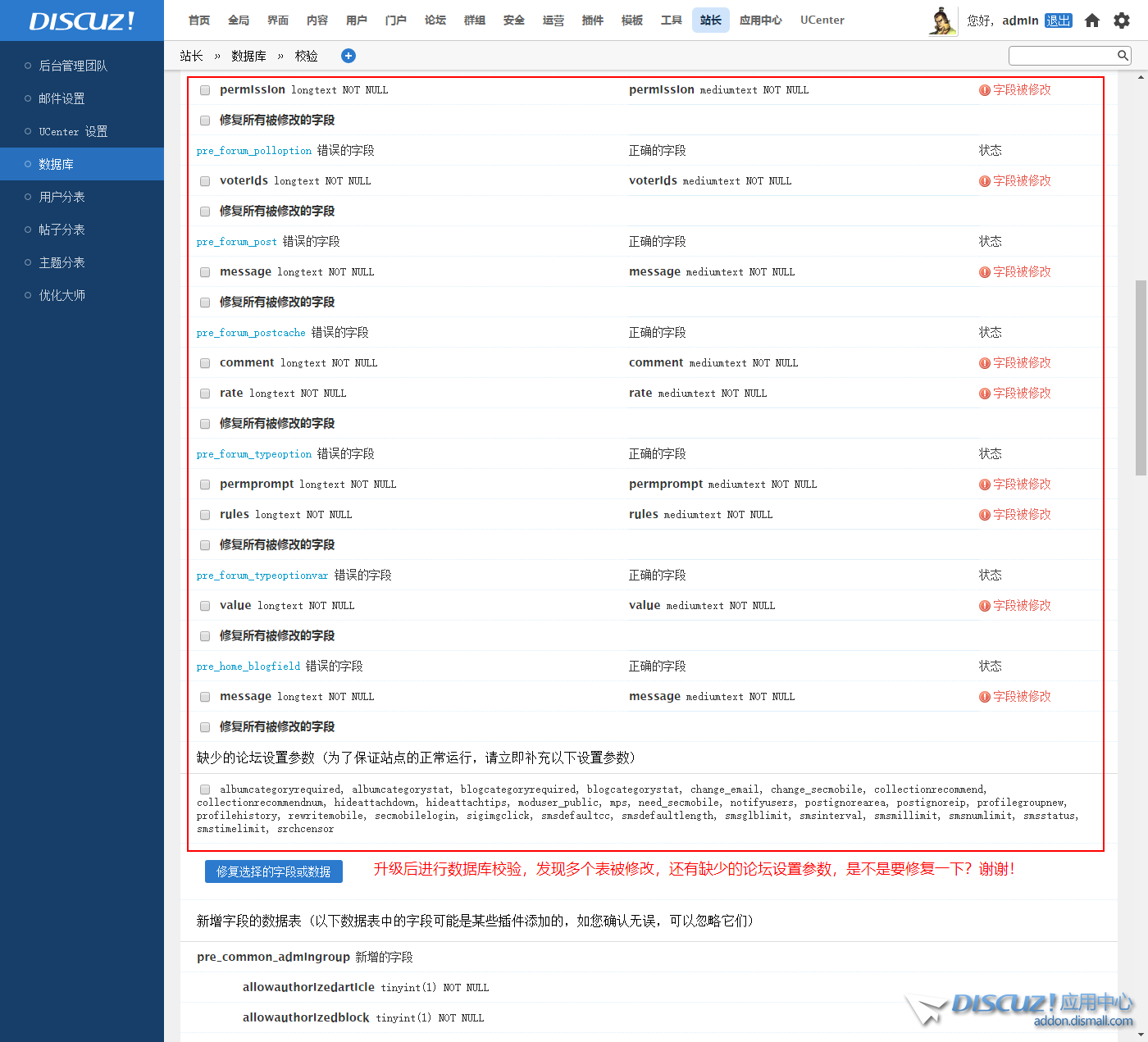 X3.4升級(jí)到X3.5后,后臺(tái)校驗(yàn)數(shù)據(jù)發(fā)現(xiàn)好多修改的表,還有缺少的論壇設(shè)置參數(shù),要不要修復(fù)一下?謝謝! 查看全文