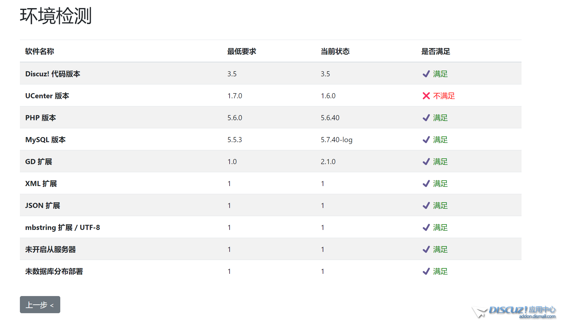 如何你確定UCenter已經(jīng)是1.7版本的話,可以把update_adult.php文件中第129行:$req_ver = array('Code Version' => '3.5', 'UCenter' => '1.7.0', 'PHP' => '5.6.0', 'MySQL' => '5.5.3', 'GD' => '1.0', 'XML' => true, 'JSON' => true, 'mbstring' => true, 'Not Slave' => true, 'Not DB Map' => true); 'UCenter' => '1.7.0',改成1.6.0試試 |