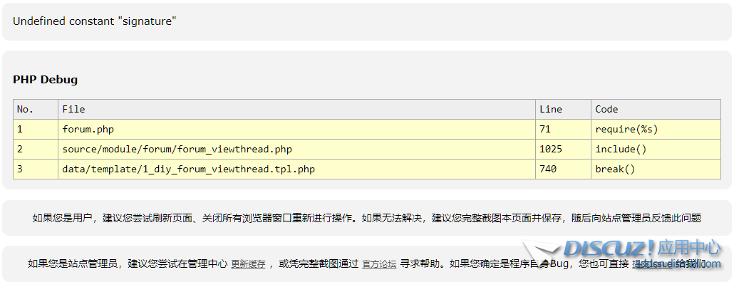 Discuz! X3.5 Release 20230210 UTF-8 Linux / PHP v8.1.7-1ubuntu3.2 帖子里含個人簽名的用戶,點開就報錯,1_diy_forum_viewthread.tpl.php里740行的兩個signature改了之后能打開了,但過一段時間又會恢復成原 ... 查看全文
