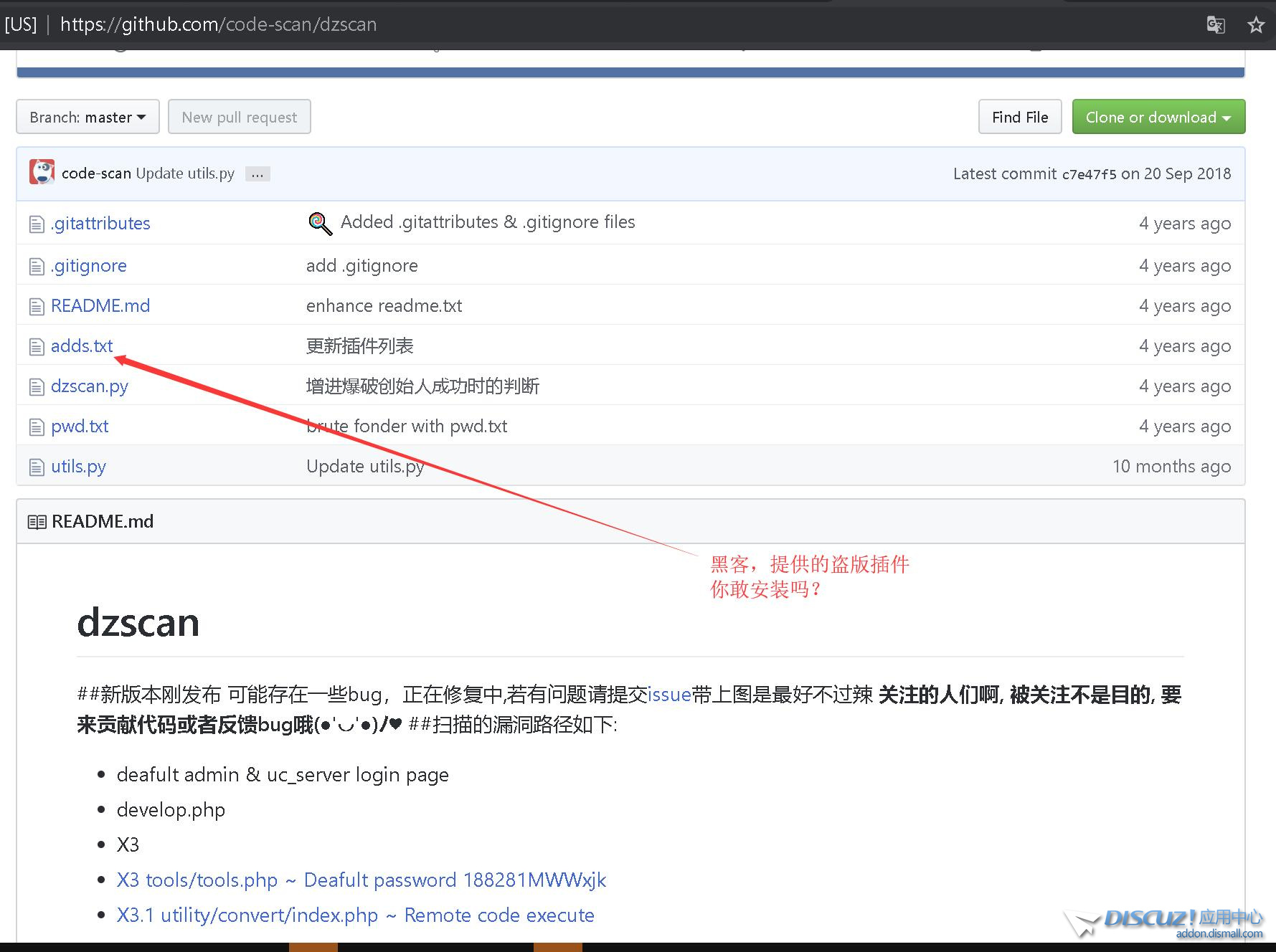 傳送門:安全小知識:為什么使用盜版插件容易被掛馬! 標(biāo)題侮辱了狗,我鄭重向狗道歉! 該黑客的github項目地址: https://github.com/code-scan/dzscan復(fù)制代碼 這個項目是一個后門掃描工具,是專門針對discuz! 項 ... 查看全文