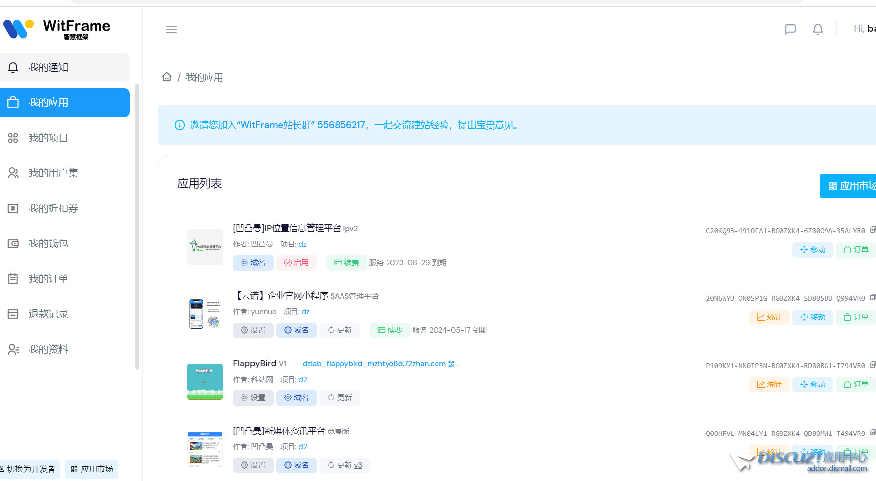 按照帖子里的各個教程,打開了這個地址 https://app.witframe.com/market/list/index 。 然后點擊購買了某個應(yīng)用,注冊登錄進入到了 witFrame后臺 https://www.witframe.com/app/index/index,看到了已 ... 查看全文