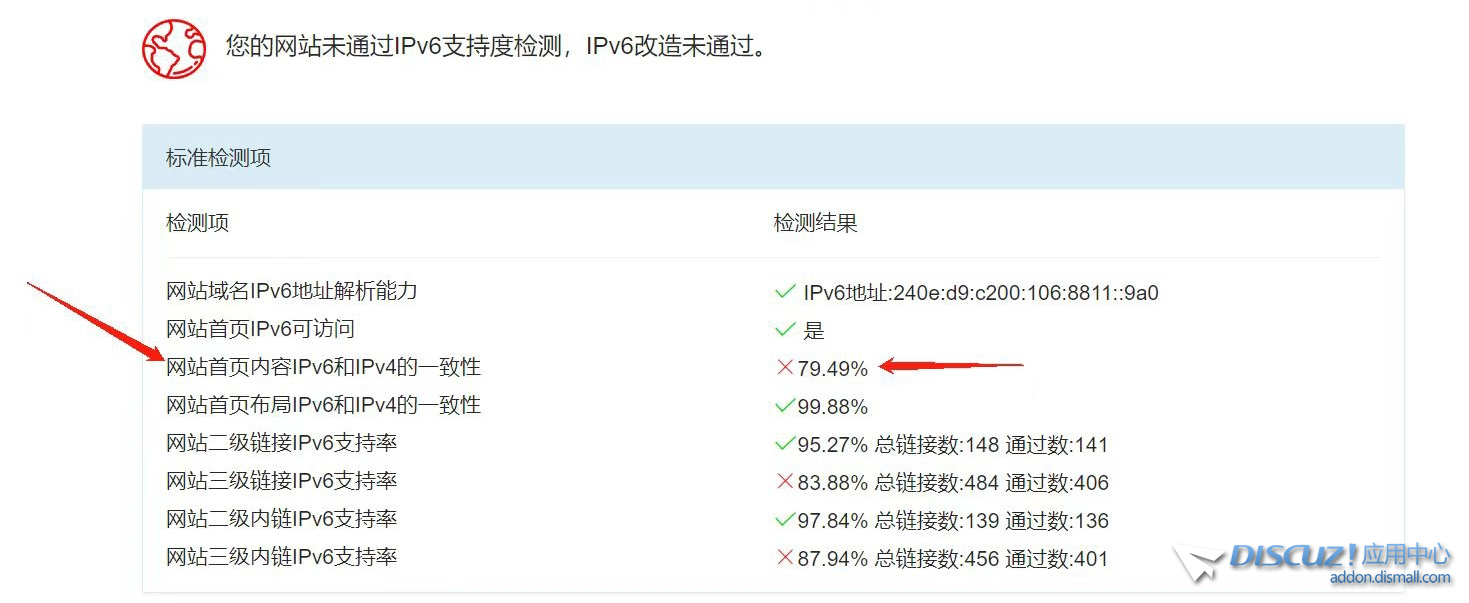 微笑的影子 發(fā)表于 2023-8-29 16:08 要不你把網(wǎng)址發(fā)出來我們幫你看看? 上面已經(jīng)說的很清楚了,是否支持IPv6,和訪問內(nèi)容是否一致這個是沒有關(guān)系的。 只能說它這個檢測標準很不合理。Discuz本身是沒問題的。 如果你們那邊為了應(yīng)付檢查,必須要有這個,那你就得專門按人家這個要求做點相應(yīng)的處理。 具體怎么處理得看具體的情況而定。 如果它檢測工具不給你具體信息,那你就得自己想辦法分析了。 |
