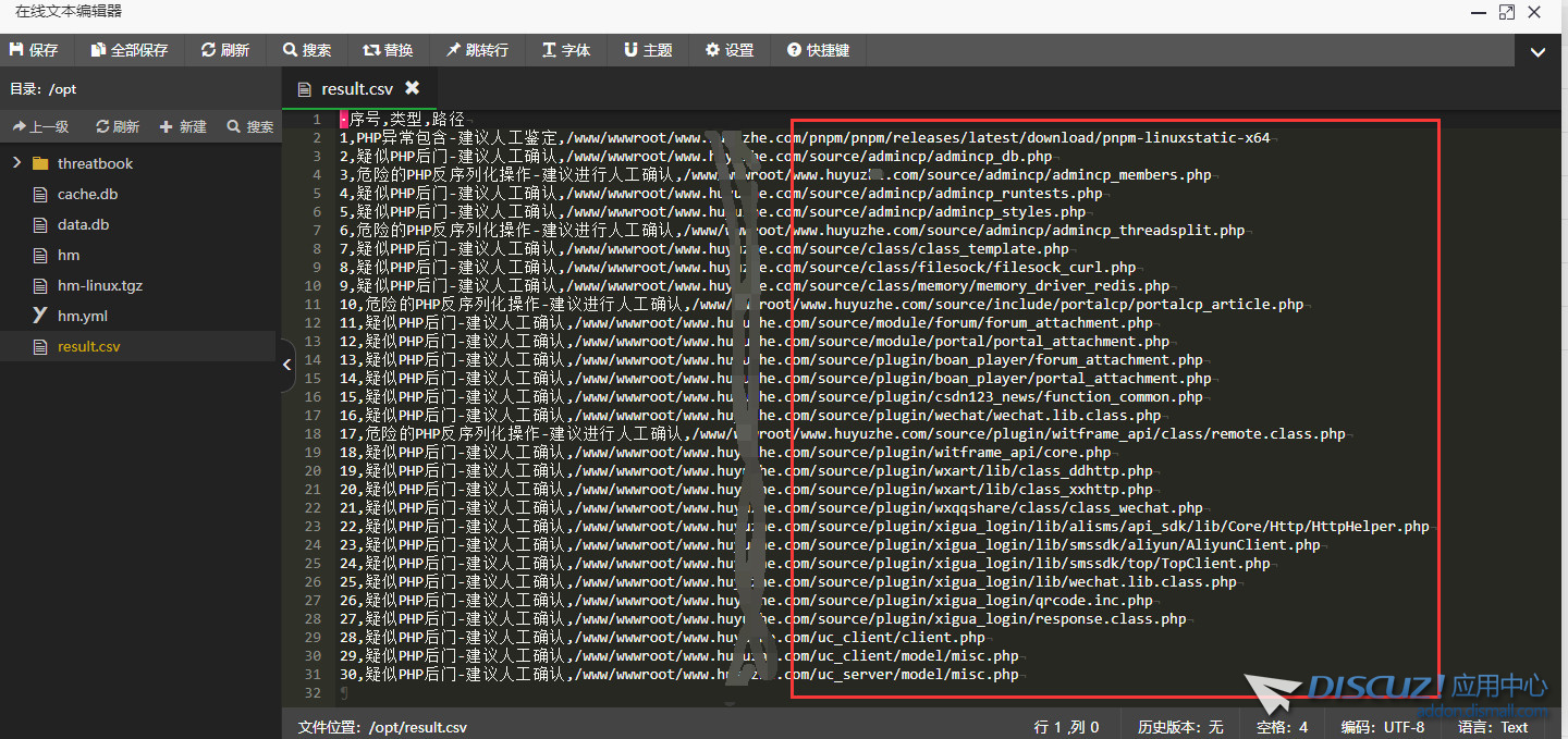 dashen 發(fā)表于 2023-10-19 12:27 可是在discuz的后臺(tái)文件校驗(yàn)?zāi)抢?,被修改文?除被篡改的其余都是確定自己修改,未知文件-都是模版下的和幾個(gè)主目錄的自己添加的,原程序頁覆蓋了。(除非被修改的文件和新增的文件在discuz后臺(tái)檢測(cè)不出來) |