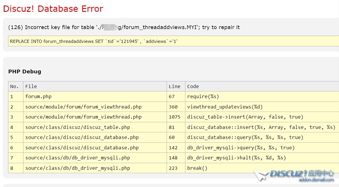 (126) Incorrect key file for table './***/forum_threadaddviews.MYI'; try to repair it REPLACE INTO forum_threadaddviews SET `tid`='121945' , `addviews`='1' |