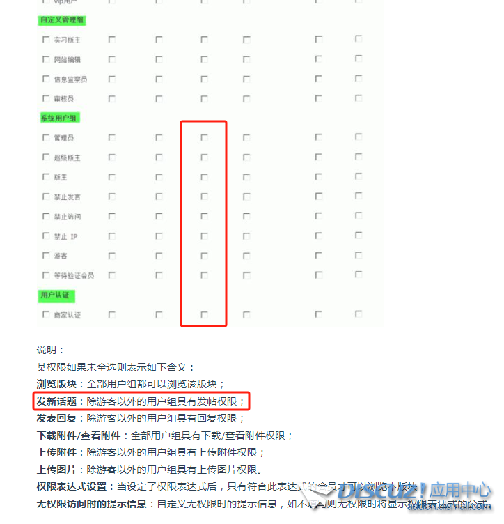 星空999 發(fā)表于 2024-1-4 10:23 你直接到dz后臺(tái)看吧! 全不選的話(huà) 默認(rèn) 是游客組沒(méi)權(quán)限, 一旦 勾選某一項(xiàng), 則代表沒(méi)有 勾選的用戶(hù)組 沒(méi)權(quán)限 |