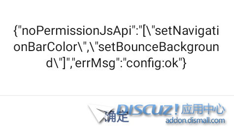 會不停的提示并點確定到最后直至關閉,請問這要如何配置或是哪個文件需要修改才可解除? {"noPermissionJsApi":"[\"setNavigati onBarColor\",\"setBounceBackgroun d\"]","'errMsg":"config:ok"} ... 查看全文