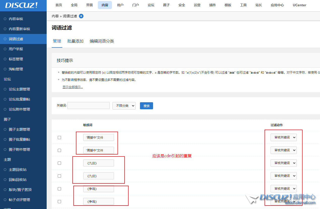 湖中沉 發(fā)表于 2024-5-5 16:05 我是 X3.5 20231221 ,20231231后臺沒提示更新,那兩個插件也安裝了嘛?會不會插件問題?或者是不是 詞語過濾 列表中 有重復(fù)詞語 造成的程序邏輯錯誤? 372頁,重復(fù)數(shù)據(jù)很多(敏感詞)會不會是插件的數(shù)據(jù)庫里就重復(fù)項(xiàng)就比較多? |