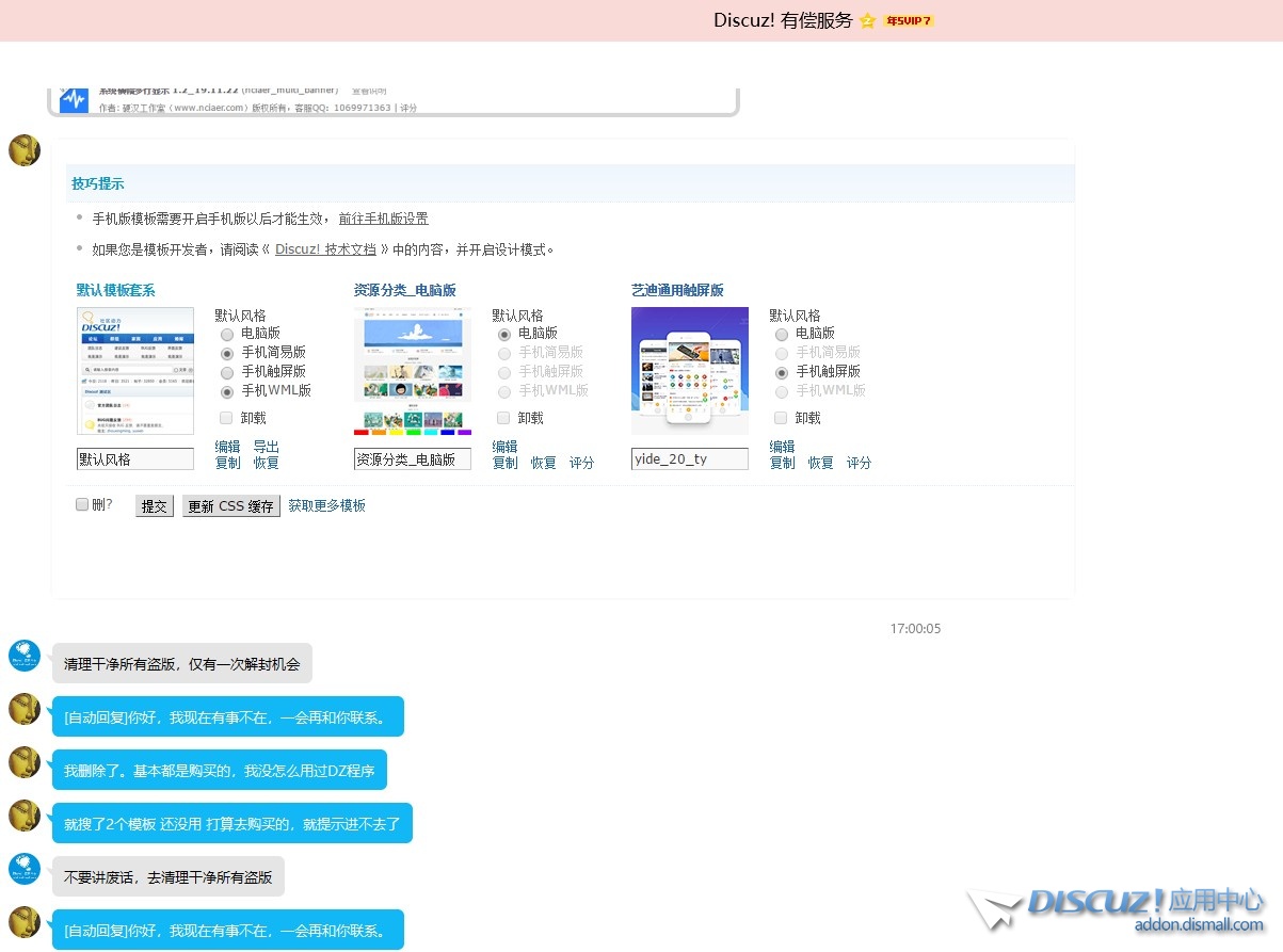 我承認(rèn)用了第三方模板 該刪的都刪了,你們要不給解,你給句話,別耗著別人,跟你們說話 像欠你們錢一樣,你們官方模板要是能某寶官方一樣 能后臺(tái)測(cè)試效果,誰去安裝第三方的模板測(cè)試效果。找你們解 不是為了買插 ... 查看全文