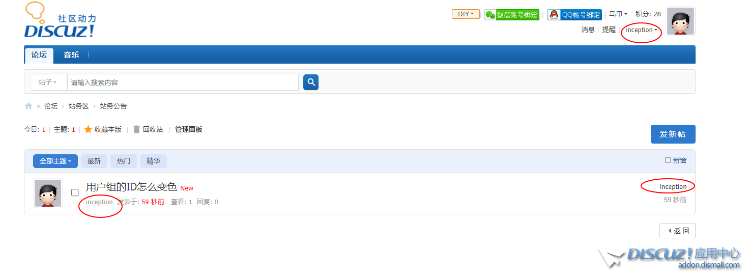 默認(rèn)模板中,更改了用戶組的顏色,上圖標(biāo)注的位置,用戶名稱的顏色就會(huì)隨之變化 但是官方的清新模板取消了這個(gè)功能,導(dǎo)致用戶的名稱顏色始終是模板默認(rèn)的 有沒有辦法更改上圖標(biāo)注用戶名的顏色呢? ... 查看全文