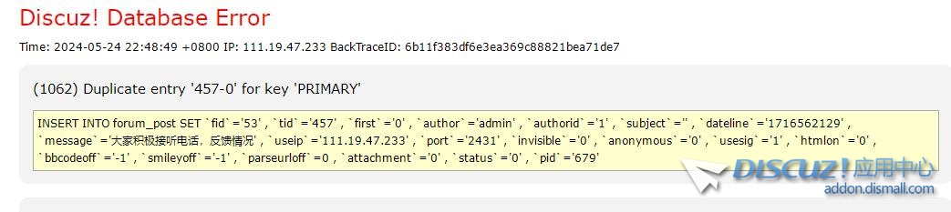 回發(fā)帖正常,回帖突然不正常了彈出,(1062) Duplicate entry '457-0' for key 'PRIMARY' 查看全文