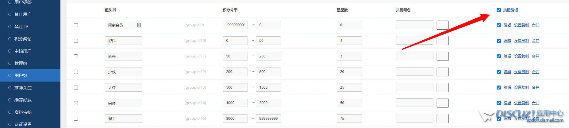 這不是BUG,而是你服務(wù)器PHP環(huán)境配置里對(duì)提交數(shù)限制過(guò)小了,多個(gè)用戶組編輯時(shí),提交的字段數(shù)大于環(huán)境限制了,就提交失敗了。自己改大PHP最大表單提交限制max_input_vars |