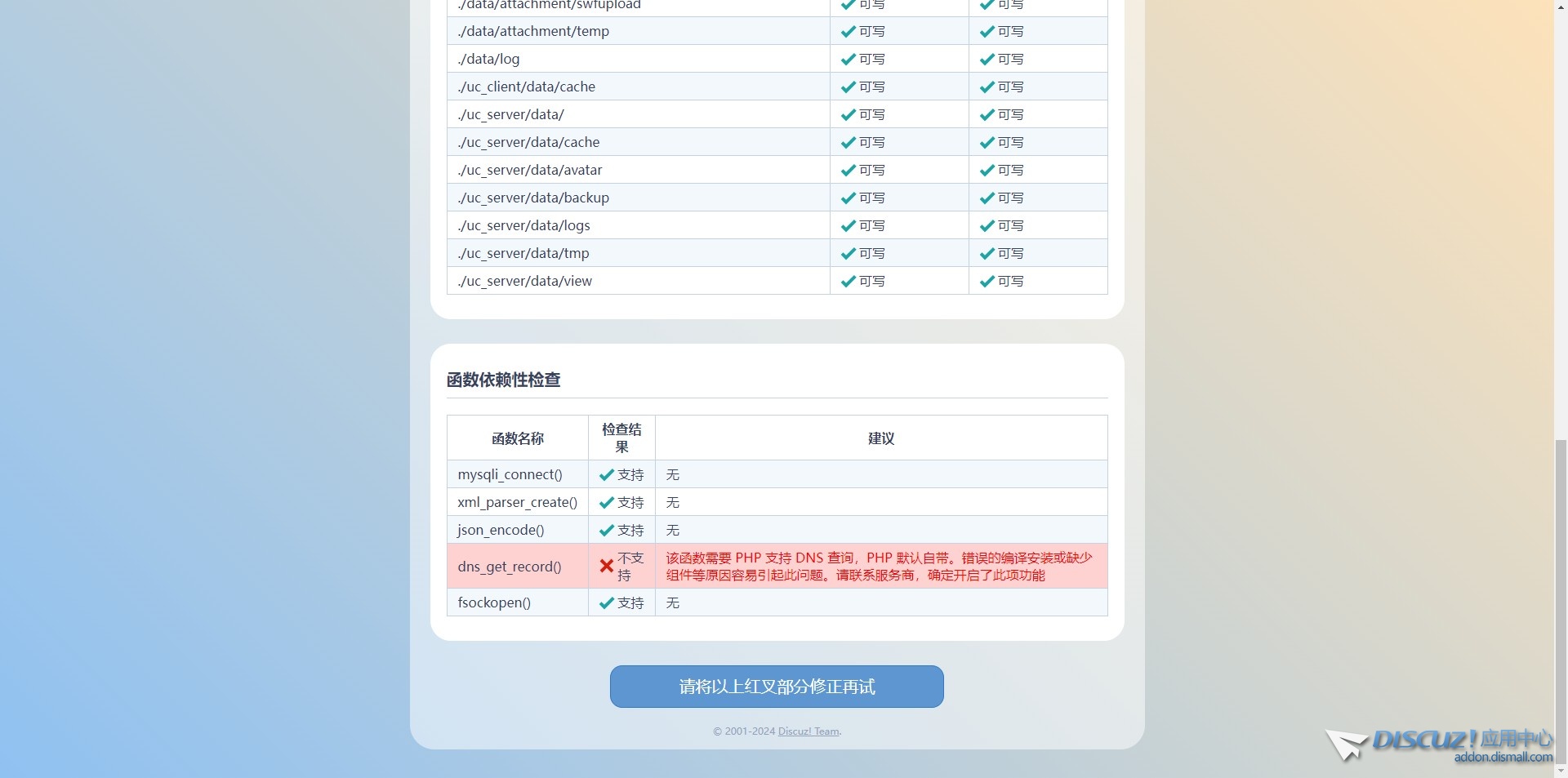 PHP環(huán)境缺少紅叉提示的功能,需要補(bǔ)充或者開(kāi)啟。 如果是你自己搭建的環(huán)境,就需要自己對(duì)php環(huán)境的dns_get_record功能進(jìn)行開(kāi)啟或者安裝。 如果是別人幫你搭建的,找搭建人幫你處理。 如果是虛擬主機(jī),找主機(jī)商幫你處理。 |