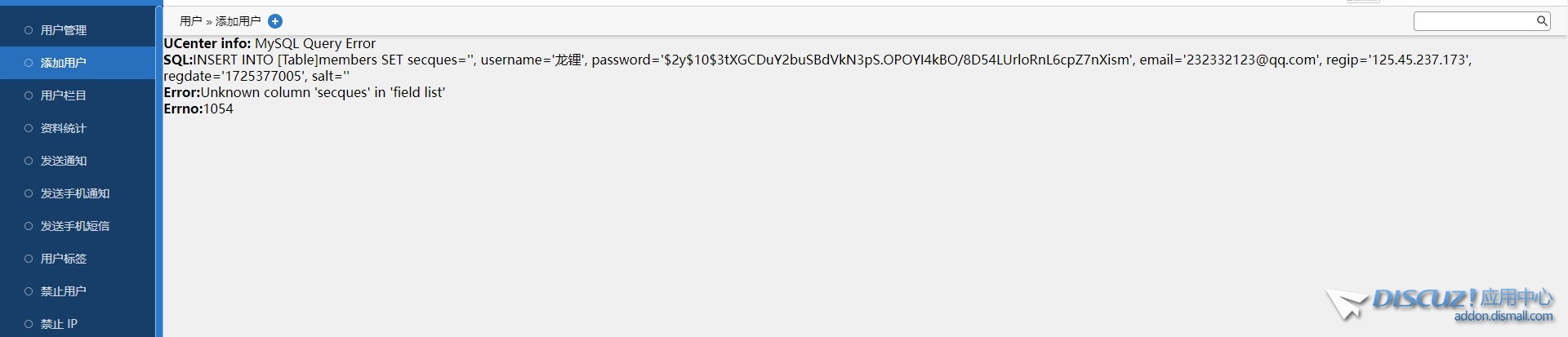 UCenter info: MySQL Query Error SQL:INSERT INTO [Table]members SET secques='', username='龍鋰來了', password='$2y$10$3tXGCDuY2buSBdVkN3pS.OPOYI4kBO/8D54LUrloRnL6cpZ7nXism', email='232332123@qq.com', ... 查看全文