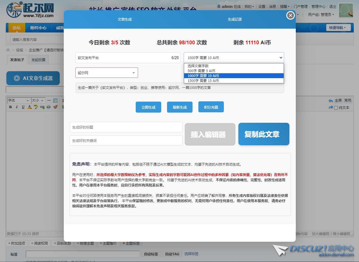 用戶生成的文章會展示在一個列表里 被搜索引擎收錄 一鍵將標(biāo)題 關(guān)鍵詞 內(nèi)容 插入到Discuz的編輯器里 分別每日免費次數(shù)和總共免費次數(shù) 次數(shù)用完就收費 可以適當(dāng)收費 或者顧慮發(fā)帖做獎勵 比如 生成文章收入10積分&nbs ... 查看全文