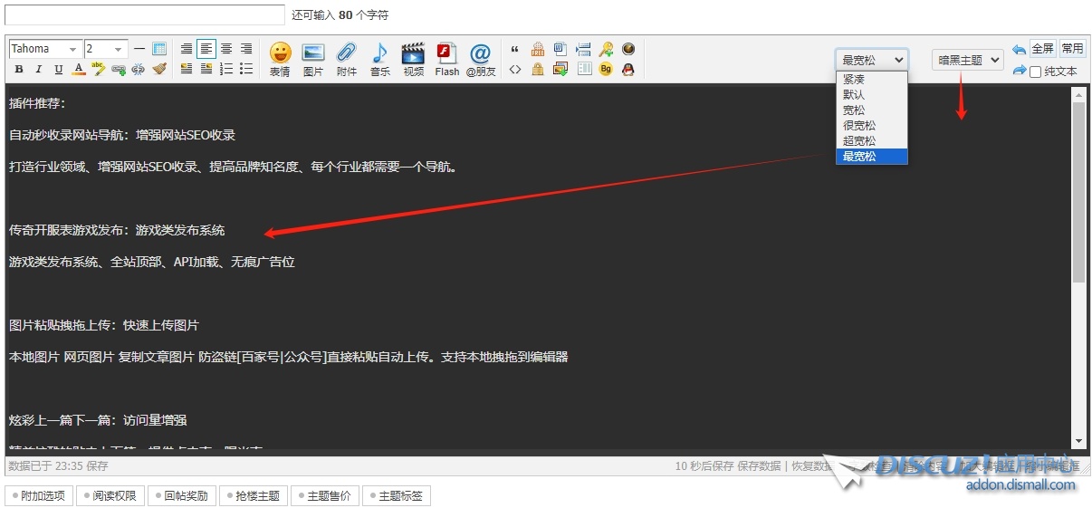 【免費(fèi)】編輯器增強(qiáng) 增加文章行高 編輯區(qū)背景顏色切換與禁用Base64圖片粘貼 插件地址:https://addon.dismall.com/plugins/qier_base64.html 查看全文
