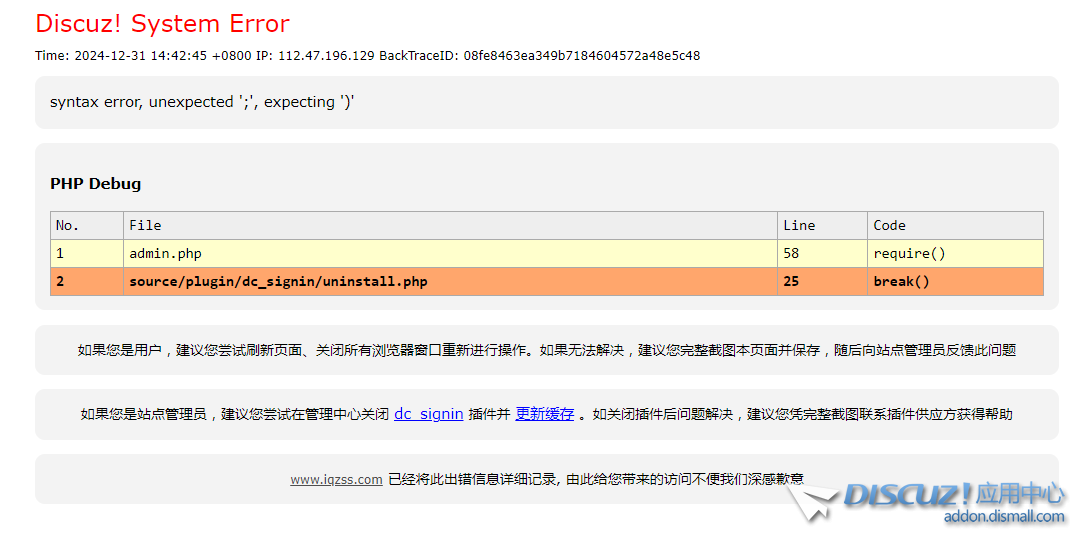 錯(cuò)誤提示:本來應(yīng)該是右括號(hào)的地方,卻寫成了分號(hào)。 插件目錄里 source/plugin/dc_signin/uninstall.php 這個(gè)文件第25行,在 break()的附近,找找有沒有個(gè)分號(hào),試試用半角的右括號(hào))把它替換一下。 |