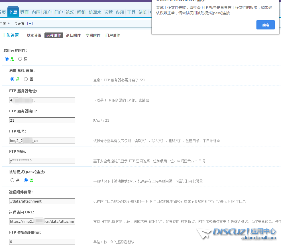 本帖最后由 學習運營 于 2020-7-26 11:49 編輯 請問大佬,開啟了遠程附件,為啥測試失敗呢?我使用ftp是可以正常上傳的,權限都給了777了,被動模式也試了,請問咋辦......小弟萬分感謝! 補充: 測試了一下阿里 ... 查看全文