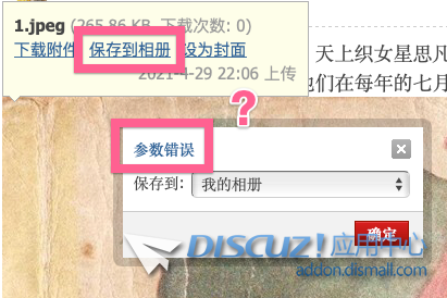 如下圖,帖子中的圖片在鼠標(biāo)光標(biāo)位置選擇“保存到相冊(cè)”,選擇一個(gè)自定義相冊(cè)后點(diǎn)擊保存,顯示“參數(shù)錯(cuò)誤” 查看全文