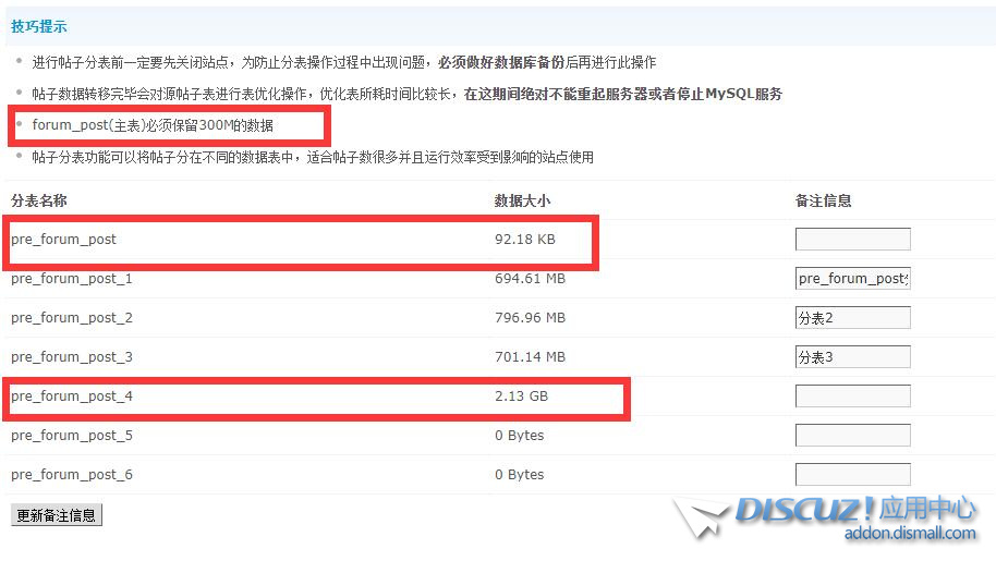 1、帖子分表要先關(guān)閉站點(diǎn) 2、pre_forum_post 要保留300mb數(shù)據(jù),不能全清空不要 3、備注信息可留空不用填寫(xiě) 4、pre_forum_post_4 分表來(lái)源,轉(zhuǎn)移數(shù)據(jù)大小 沒(méi)有選擇吧! |