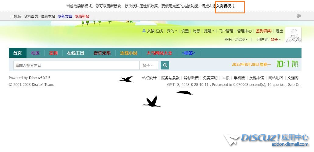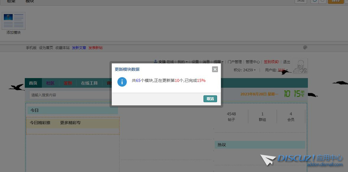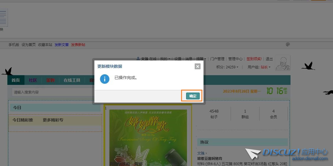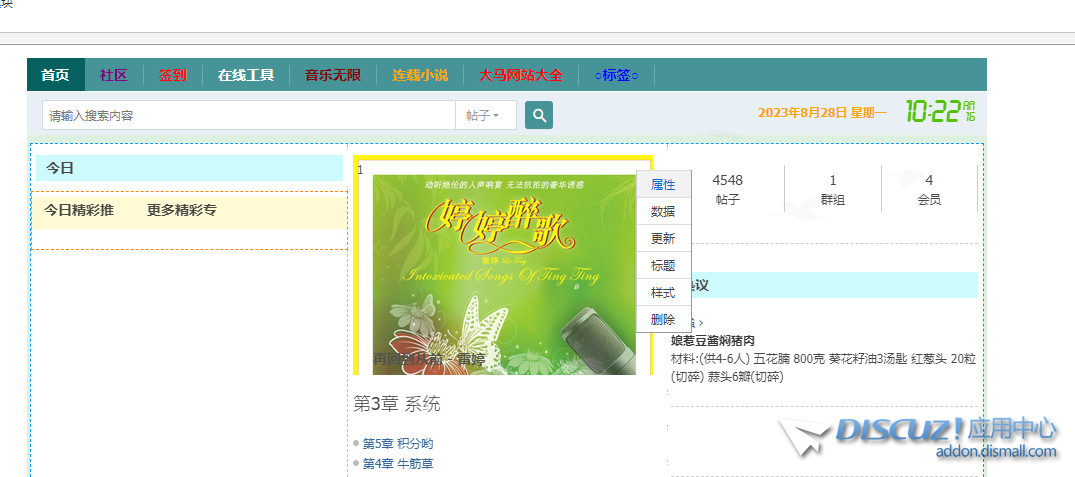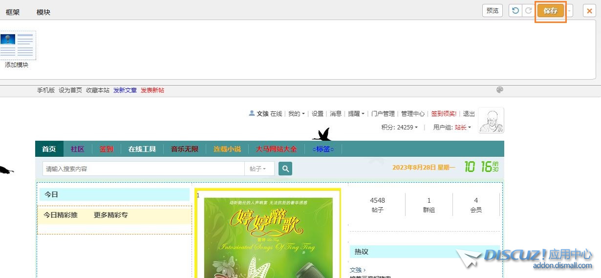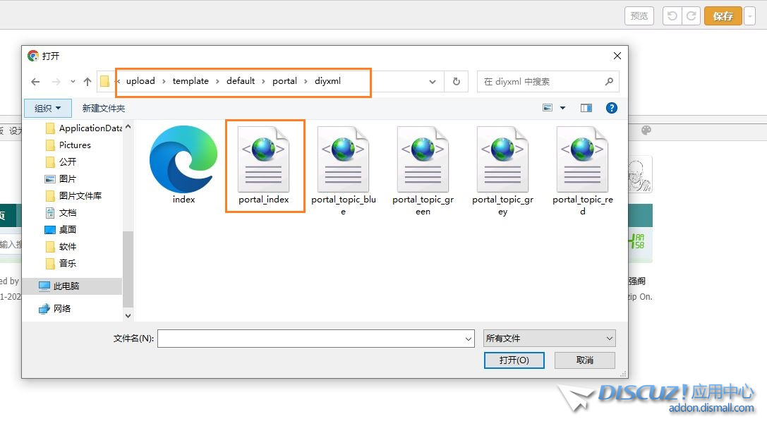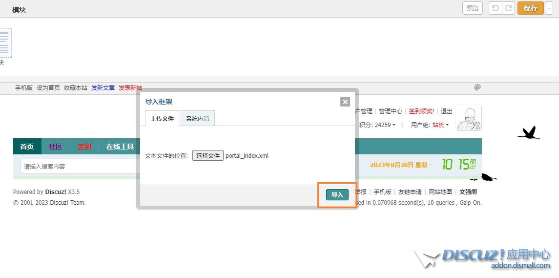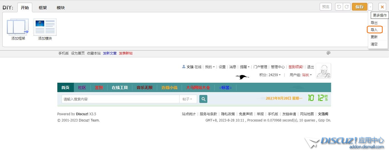 你在門(mén)戶(hù)頁(yè)面右上角點(diǎn)擊 → DIY 高級(jí)模式 → 在‘保存’旁邊選擇‘導(dǎo)入’,在彈出的窗口點(diǎn)擊’選擇文件‘,找到你下載的 Discuz 程序文件夾,點(diǎn)擊 upload\template\default\portal\diyxml\portal_index.xml,接著’導(dǎo)入‘,’保存‘就完成了;如圖: