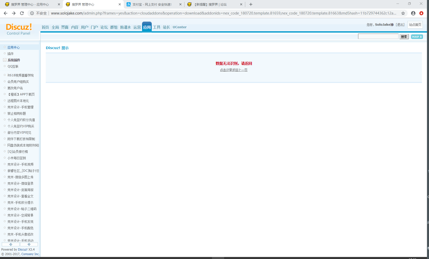 [已處理] 安裝模板時(shí)“提示"數(shù)據(jù)無法識(shí)別,請返回"” |